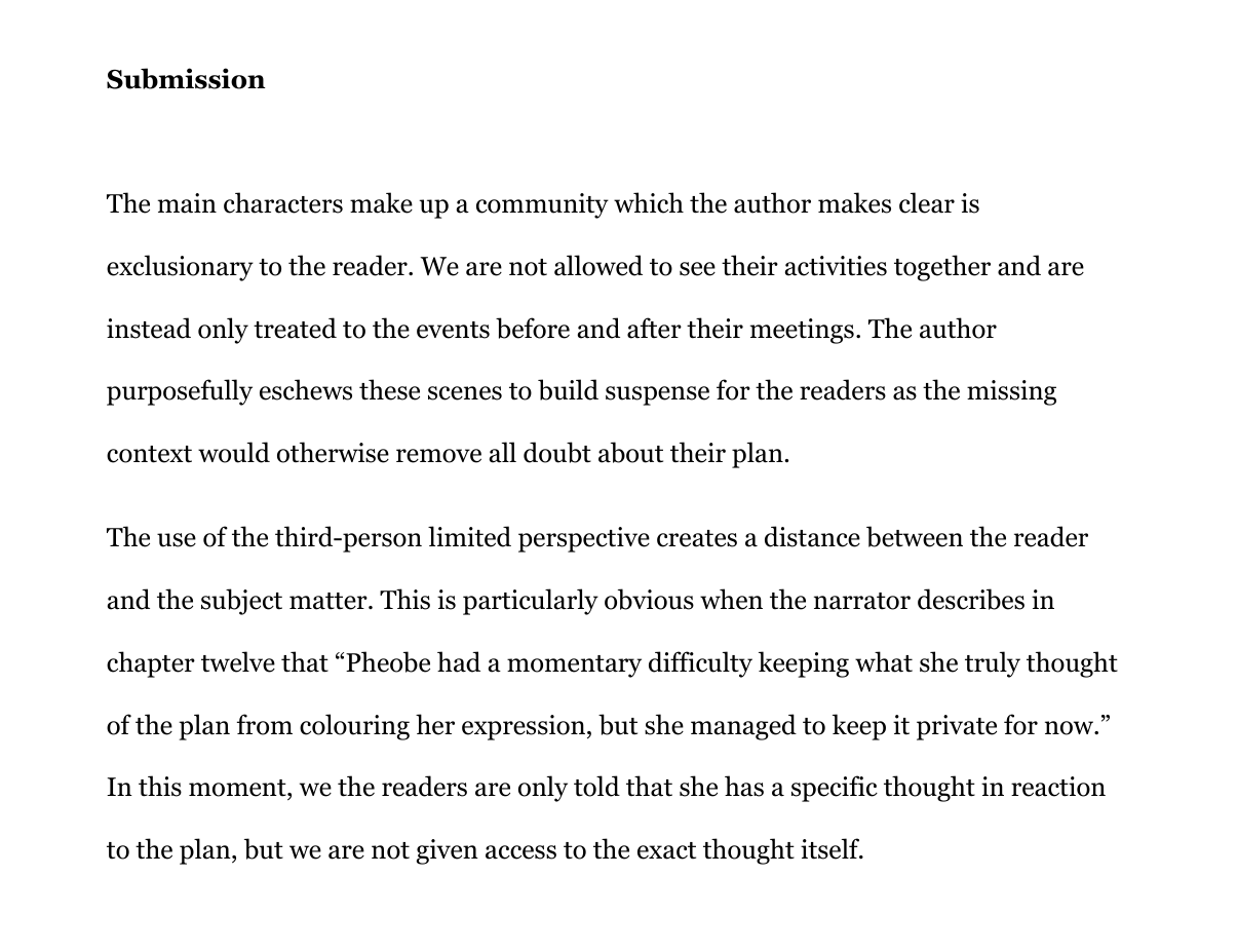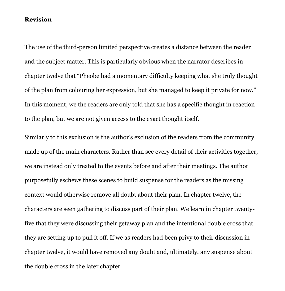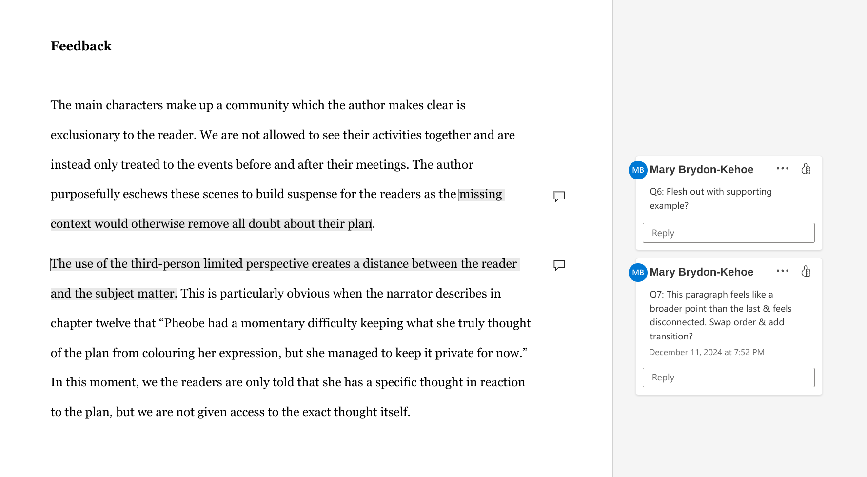Amala is looking for a review of her 3,500-word literary analysis paper. She wants to ensure her arguments are presented logically and supported clearly. She’s done a fair bit of academic writing before this, but she’s never had anything professionally edited before. She feels confident taking the direction of the queries without seeing specific rewriting examples, so she opts for a light developmental edit.