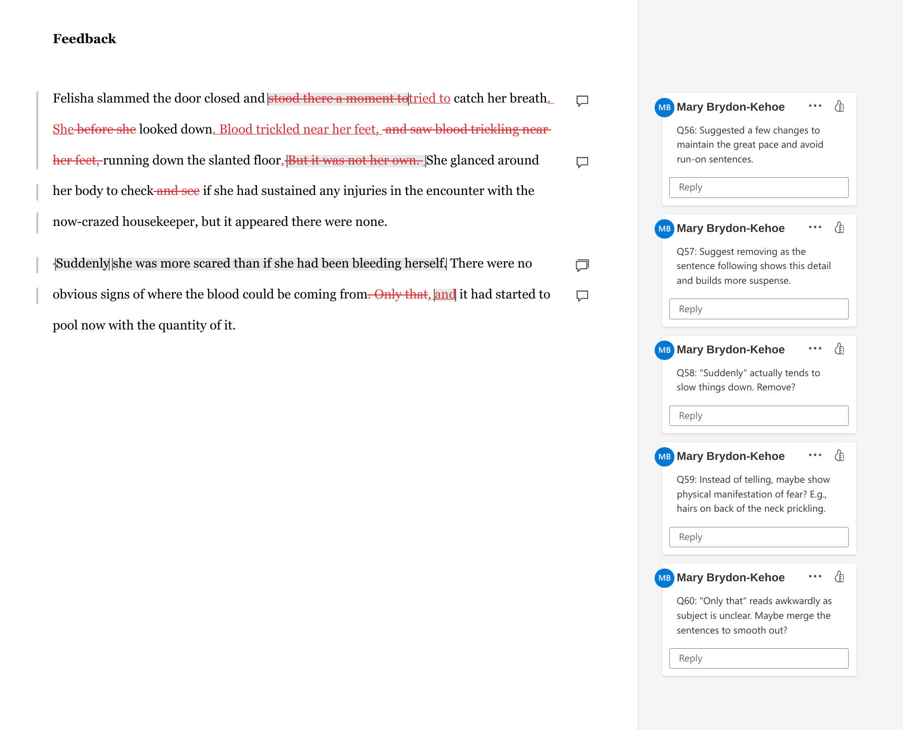 Feedback here is presented in queries (numbered comments on the right-hand side) and in-line suggestions addressing Marcus’s concerns about the narrative voice and feeling. Marcus can ask questions to clarify the queries, but he is responsible for making any changes himself.